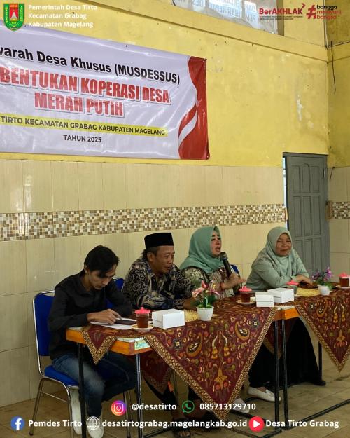 Musyawarah Desa Khusus Pembentukan Koperasi Desa Merah Putih Desa Tirto tersebut dihadiri oleh Camat Grabag Sri Utari, Kepala Desa Tirto beserta Perangkat Desa, BPD, Lembaga Desa, Tokoh Masyarakat, dan Pengurus Bumdes Gesang Mandiri Desa Tirto.