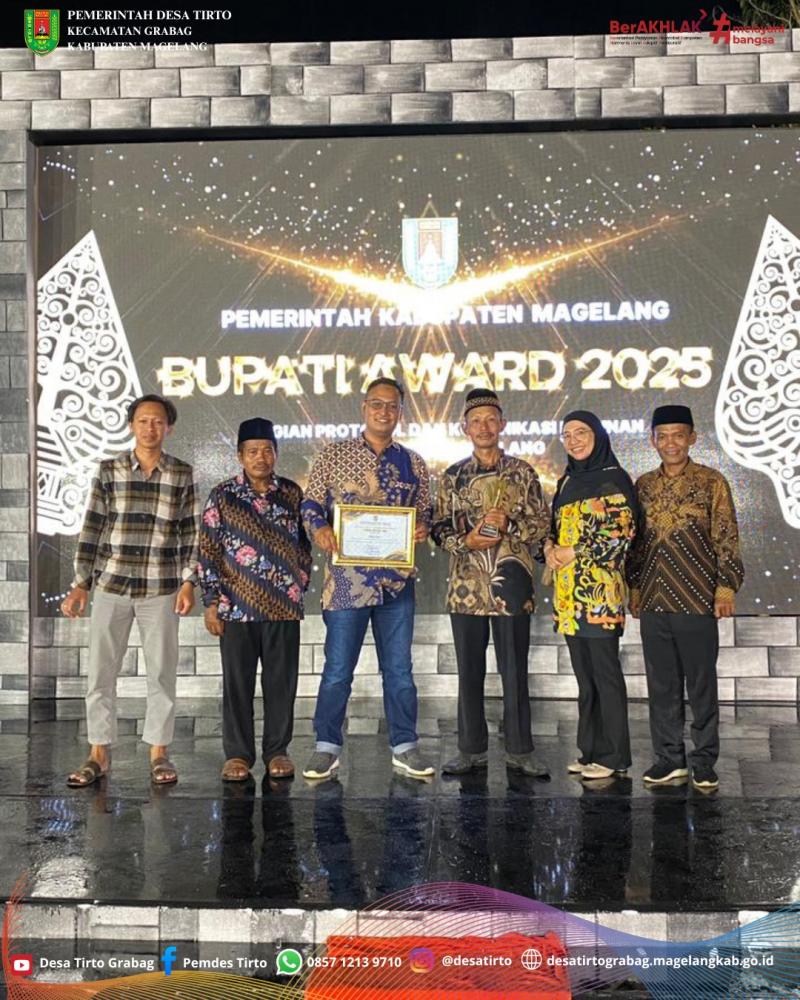 Magelang, 10 November 2025 — Pemerintah Kabupaten Magelang menggelar ajang Bupati Award 2025 sebagai bentuk apresiasi kepada masyarakat dan desa yang berinovasi serta berkontribusi dalam pembangunan daerah. Dalam acara bergengsi yang digelar di Balkondes Tuk Songo, Kecamatan Borobudur, Bupati Magelang Grengseng Pamuji menyerahkan penghargaan kepada sembilan warga dan dua desa berprestasi, salah satunya berasal dari Desa Tirto, Kecamatan Grabag.