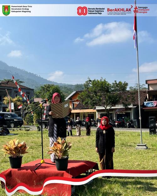 Dalam amanatnya, Kepala Desa Tirto, Lilik Harlina, menyampaikan pesan mendalam mengenai makna kemerdekaan. Beliau menegaskan bahwa kemerdekaan bukanlah hadiah, melainkan lahir dari pengorbanan para pahlawan. Semangat juang tersebut harus senantiasa hidup di dada setiap anak bangsa. Dengan mengangkat tema tahun ini, “Bersatu Berdaulat, Rakyat Sejahtera, Indonesia Maju”, Kepala Desa mengajak seluruh warga untuk memperkuat persatuan di tengah perbedaan, menjaga kedaulatan bangsa, dan bersama-sama membangun masa depan yang lebih baik. Pesan khusus juga disampaikan kepada generasi muda agar menjadi garda terdepan dalam menjaga persatuan di era digital, menolak intoleransi, serta menciptakan karya yang membanggakan bagi bangsa. Amanat tersebut ditutup dengan seruan lantang, “Dirgahayu Republik Indonesia! Merdeka! Merdeka! Merdeka!”