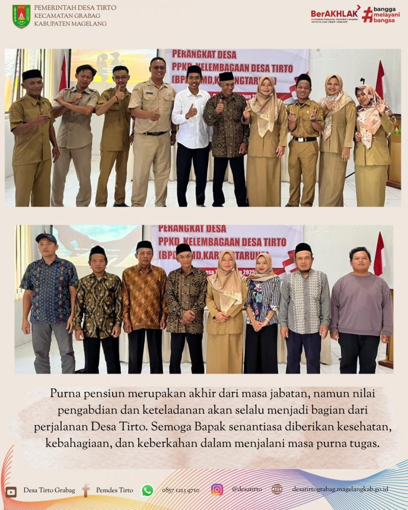 Selain agenda musyawarah, kegiatan ini juga dirangkai dengan acara perpisahan dan penyerahan Surat Keputusan (SK) pemberhentian dengan hormat kepada perangkat Desa Tirto atas nama Muhamad Subero, yang sebelumnya menjabat sebagai Kepala Dusun Tempel. Muhamad Subero resmi memasuki masa purna tugas terhitung sejak 27 Desember 2025, setelah mencapai usia 60 tahun.