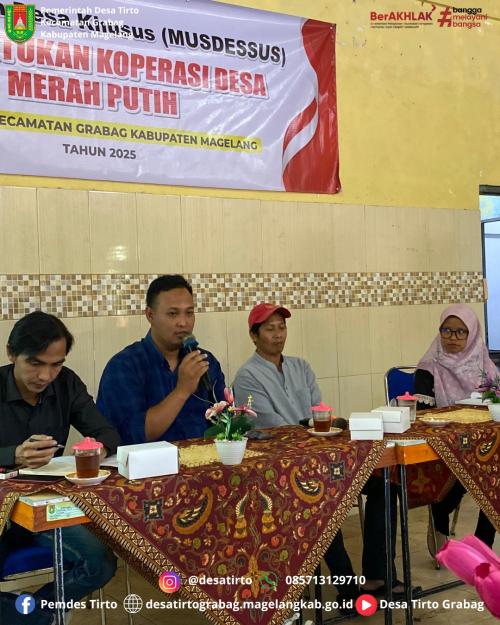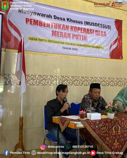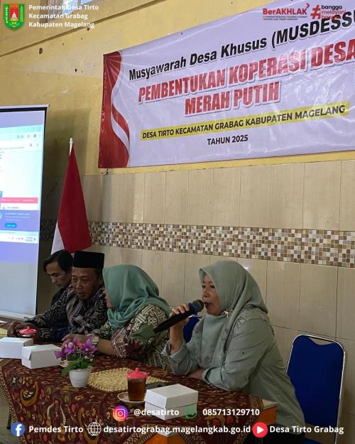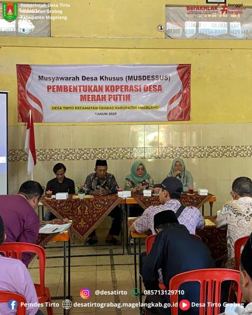 Musyawarah Desa Khusus Pembentukan Koperasi Desa Merah Putih Desa Tirto tersebut dihadiri oleh Camat Grabag Sri Utari, Kepala Desa Tirto beserta Perangkat Desa, BPD, Lembaga Desa, Tokoh Masyarakat, dan Pengurus Bumdes Gesang Mandiri Desa Tirto.