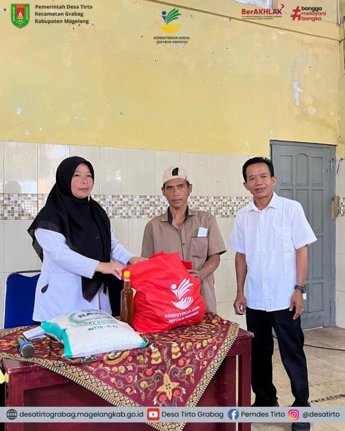 "Desa Tirto berterimakasih telah mendapat kesempatan dari Kemensos RI bisa memfasilitasi penyerahan bantuan bagi kelompok rentan dan disabilitas, dan bagi yang mewakili pengambilan ketika sampai dirumah harap paket sembako yang diberikan harap difoto sama penerima yang asli".