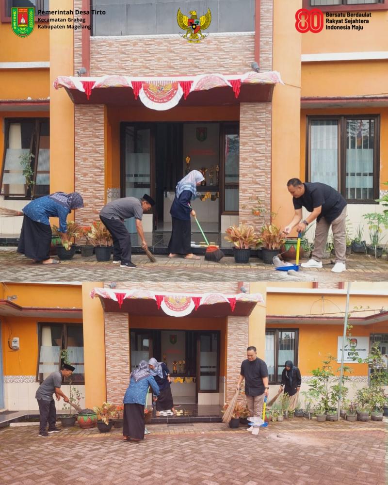Tirto – Jumat (8/8/2025), Pemerintah Desa Tirto melaksanakan kegiatan bersih-bersih lingkungan Kantor Balai Desa Tirto. Kegiatan ini merupakan bagian dari inovasi daerah Kecamatan Grabag “Grabestie”, sekaligus menyambut HUT ke-80 Kemerdekaan Republik Indonesia.