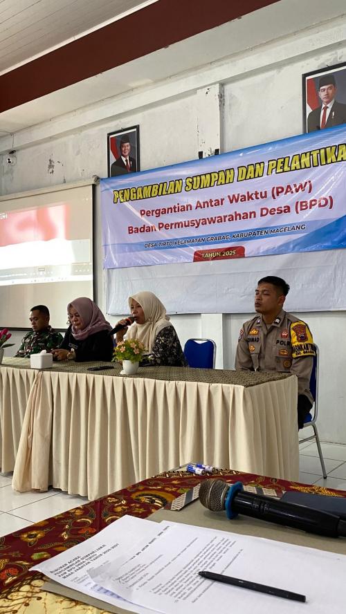Tirto, Grabag Kabupaten Magelang, 2025 – Pemerintah Desa Tirto Kecamatan Grabag menggelar acara Pengambilan Sumpah dan Pelantikan Pergantian Antar Waktu (PAW) Badan Permusyawaratan Desa (BPD) Desa Tirto tahun 2025. Acara ini dilangsungkan dengan khidmat dan tertib serta dihadiri oleh unsur pemerintahan dan kelembagaan desa pada hari Rabu, 6 Agustus 2025.