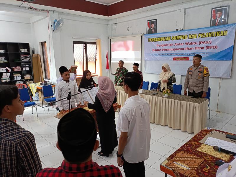 Acara dibuka oleh Risnawati selaku pembawa acara, yang mengarahkan seluruh rangkaian kegiatan dengan tertib dan penuh kehangatan. Rangkaian resmi dimulai dengan pembacaan Surat Keputusan Bupati Magelang tentang pengangkatan anggota PAW BPD oleh Sukmono Adi, S.Sos.